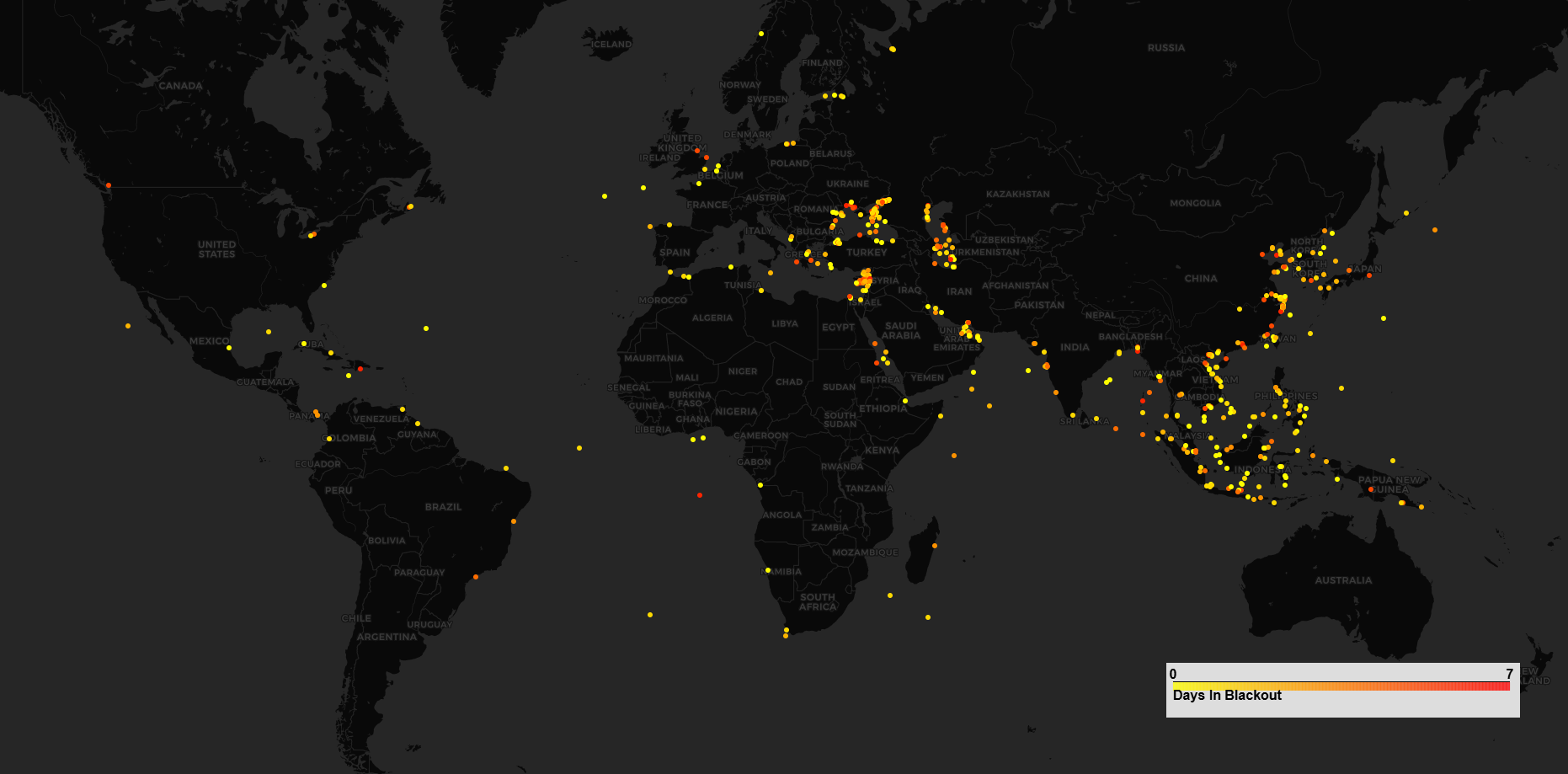 Instant snapshot of all vessels being in blackout (i.e not sending any AIS signal since more than 24 hours) and duration of the blackout event.